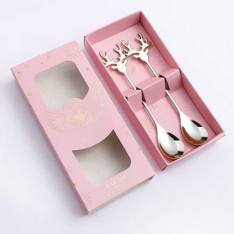2pcs /Pack Christmas 304 Stainless Steel Deer Stirring Spoon Coffee Dessert Scoop, Color: Silver+Pink Box