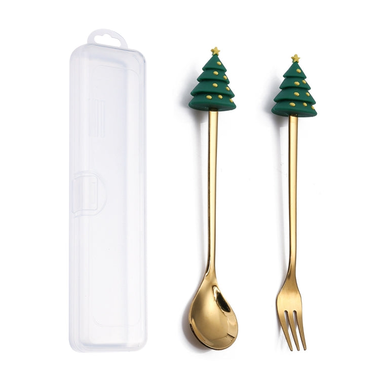 2pcs /Pack Christmas Dessert Fork And Spoon Set Portable Cute Cartoon Tableware, Style: Christmas Round Tree Golden