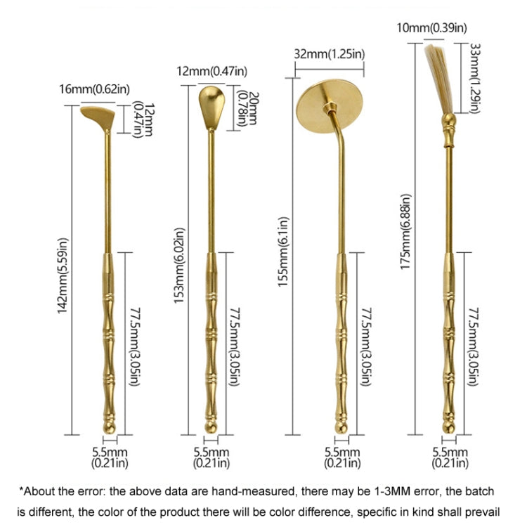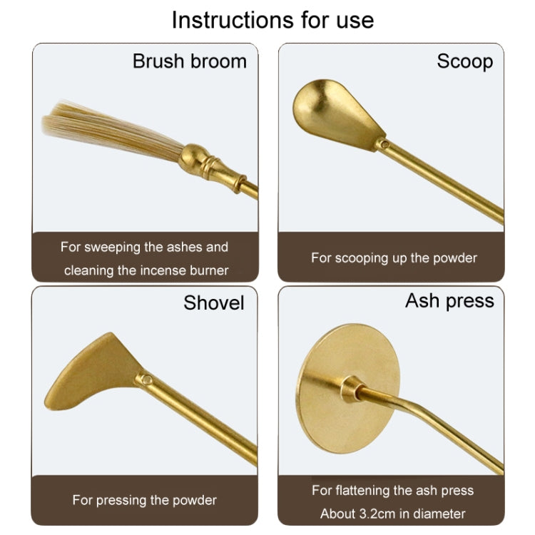 7. Size: brush sweep length of about 17.5cm, ash pressure length of about 15.5cm, incense spoon length of about 15.3cm, incense shovel length of about 14.2cm