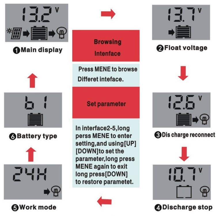 7. Controller default is B2 charging lithium-ion batteries (lithium batteries) mode; using lead-acid battery controller battery type please set B1; lithium iron phosphate batteries set to B3
