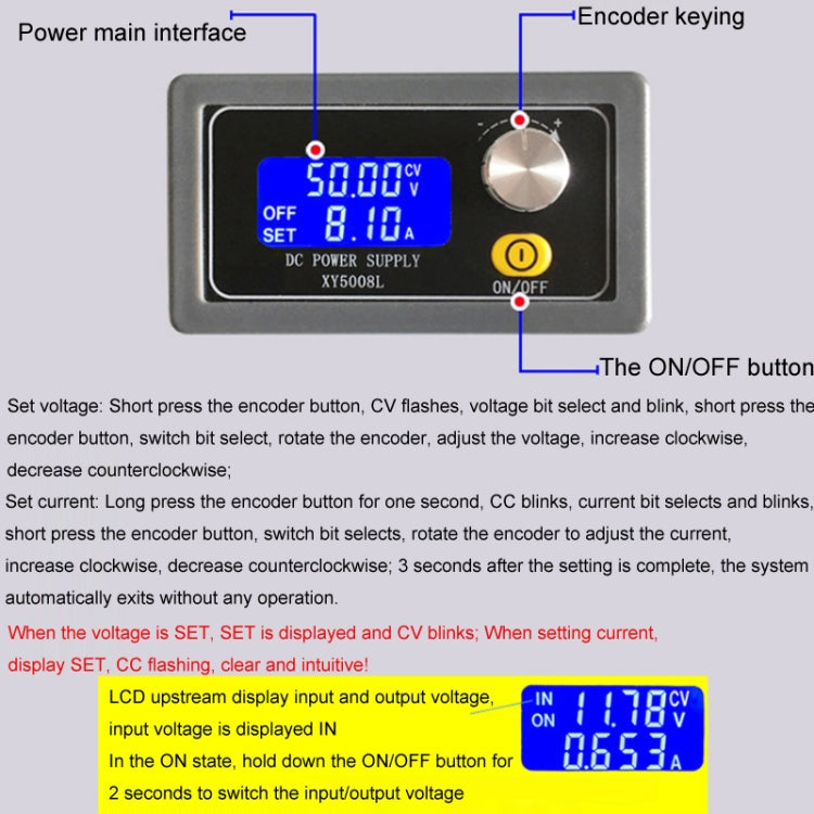 18. The product has a locking function: press and hold the encoder button for 5 seconds to lock the set voltage and current to prevent misoperation. After locking, press and hold the encoder button for 5 seconds to unlock.