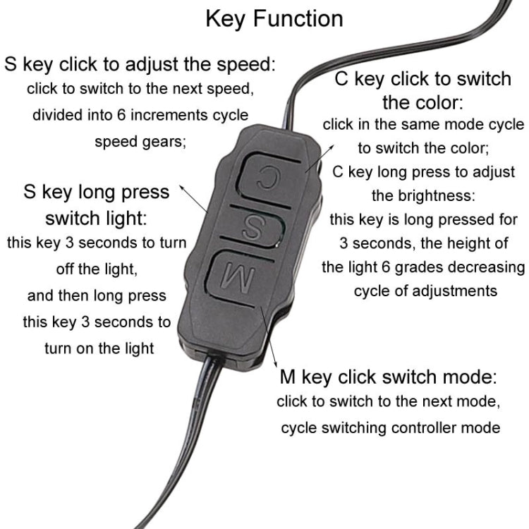 5. C key long press to adjust the brightness: long press this key for 3 seconds, the height of the light 6 grades decreasing cycle of adjustment
