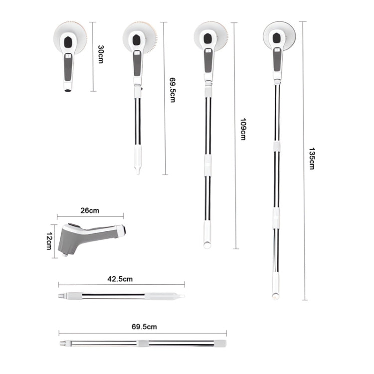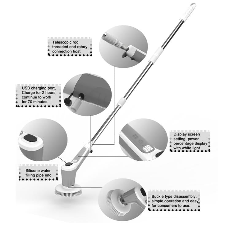 1. Cordless electric rotary scrubber, built-in 4500 mAh lithium battery, 2 hours of charging, can work continuously for 70 minutes, and there is also an LED power display, so you don't have to worry about running out of power during cleaning.