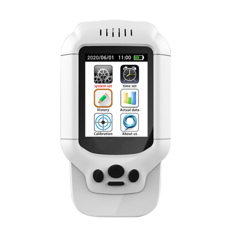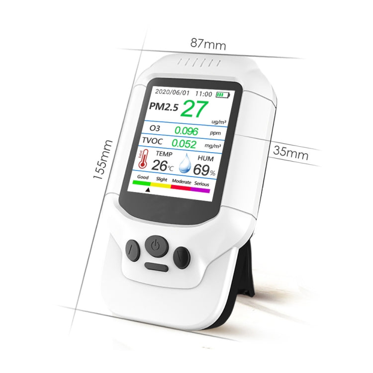 This product is a multifunctional air quality detector that detects Ozone( O3), Total Volatile Organic Compounds (TVOC), Particulate Matter <2.5 micron-sized particles (PM2.5/1.0/10), Temperature, and Humidity with clock and record function. As a scientific air quality detection device, it combines multiple air sensors with a built-in fan to allow real-time monitoring of Ozone(O3), total volatile organic compounds (TVOC), PM2.5/1.0/10, temperature, and humidity on its digital LCD display.