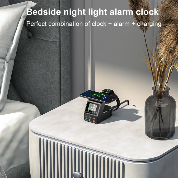1. 9-in-1 Multifunctional Charging: Integrates an alarm clock, wireless charging for smartphones, and wireless charging for smartwatches, catering to multiple devices.