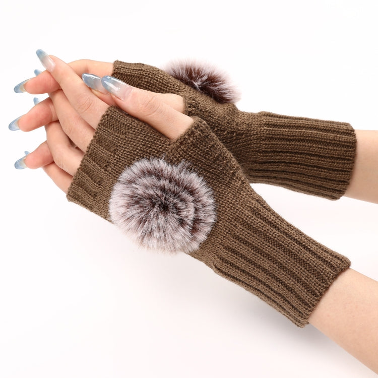 Autumn And Winter Women Fingerless Fur Ball Gloves Knitted Wool Warm Sleeves(Khaki)