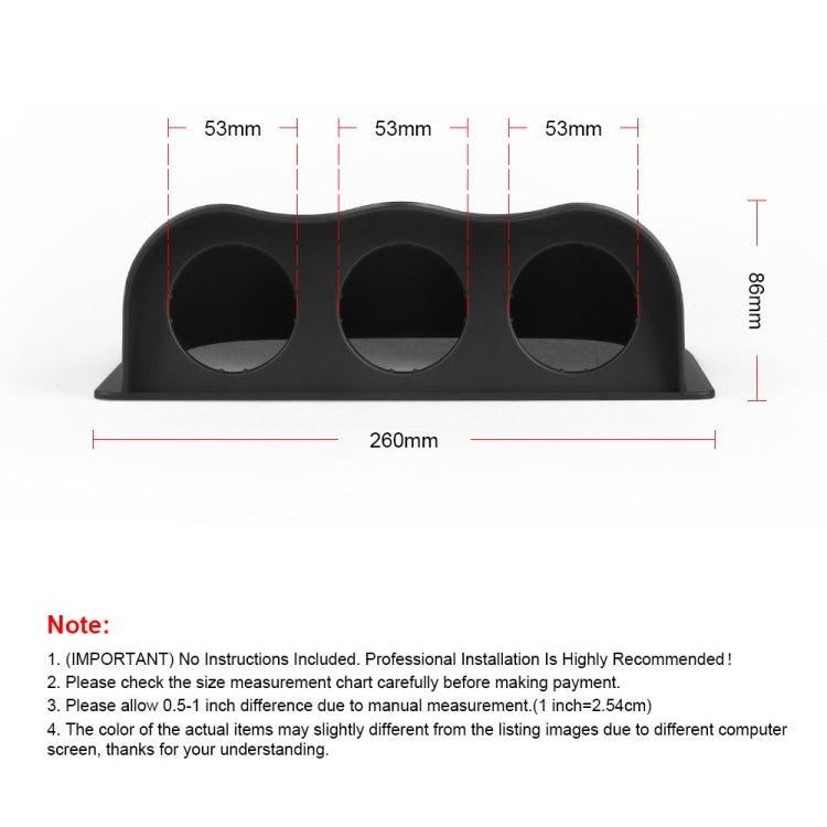 1. Specially designed for holding three automobile gauges (with 52mm diameter), like 52mm water temperature meter, 52mm oil pressure meter, 52mm tachometer and so on.
