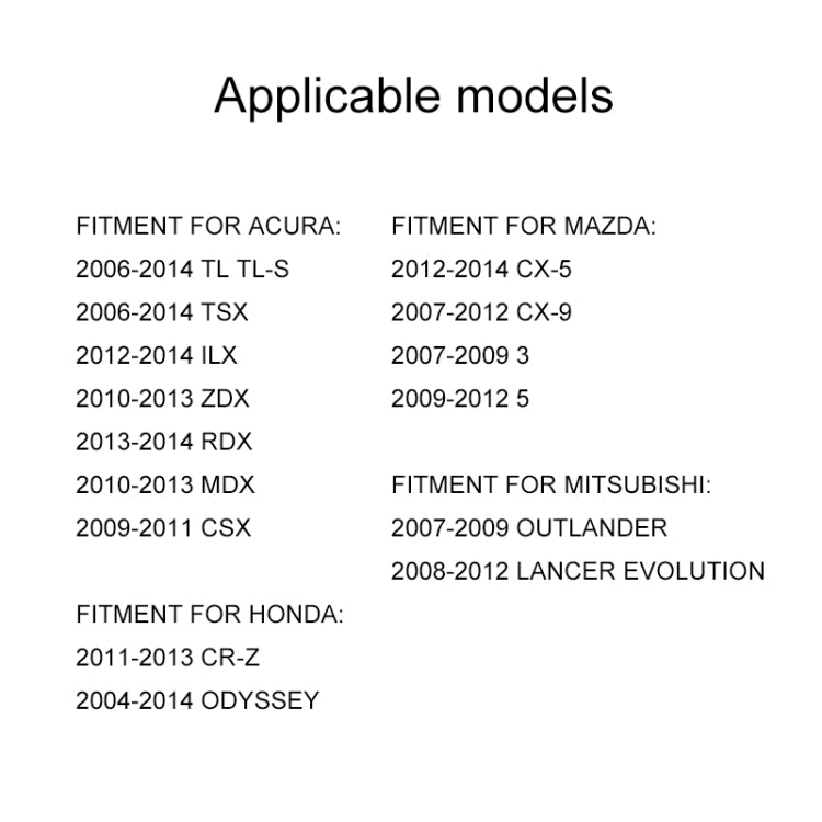 10. Applicable models: suitable for Honda Accord 8th generation, Odyssey 2004-2014, Civic, CRV, CR-Z 2011-2013, Acura TL TL-S 2006-2014, TSX 2006-2014, ILX 2012-2014, ZDX 2010- 2013, RDX 2013-2014, MDX 2010-2013, CSX 2009-2011, applicable to Mazda CX-5 2012-2014, CX-9 2007-2012, 3 2007-2009, 5 2009-2012, applicable to Mitsubishi Outlander 2007- 2009, Lancer Evolution 2008-2012