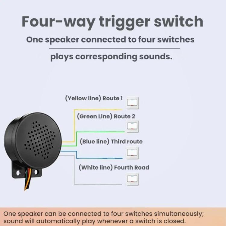 12. One speaker can connect to four switches simultaneously; the sound will automatically play whenever a switch is closed.
