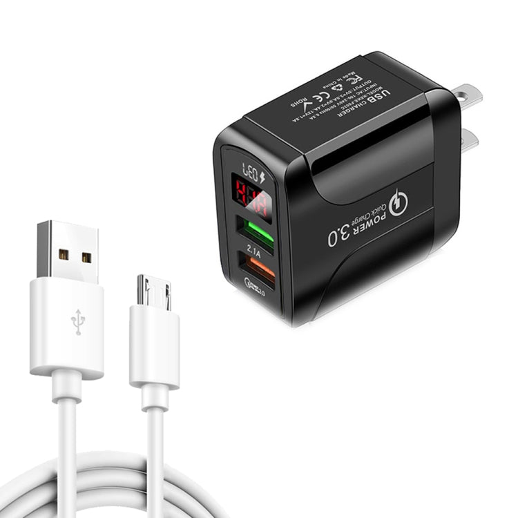 F002C QC3.0 USB + USB 2.0 LED Digital Display Fast Charger with USB to Micro USB Data Cable, US Plug(Black)