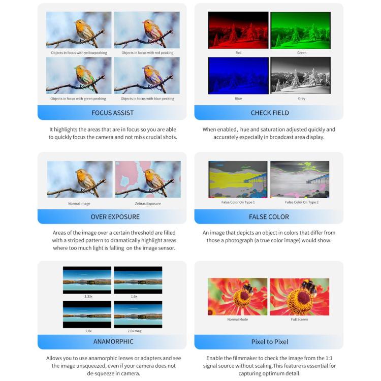 7. Focus Assist(Red, Green, Blue three focus colors optional; 1~10 focus level adjustable)