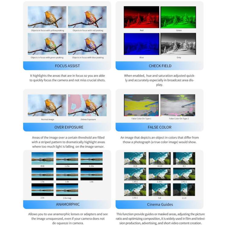 6. Focus Assist(Yellow, Red, Green, Blue, White five focus colors optional; 1~8 focus level adjustable)