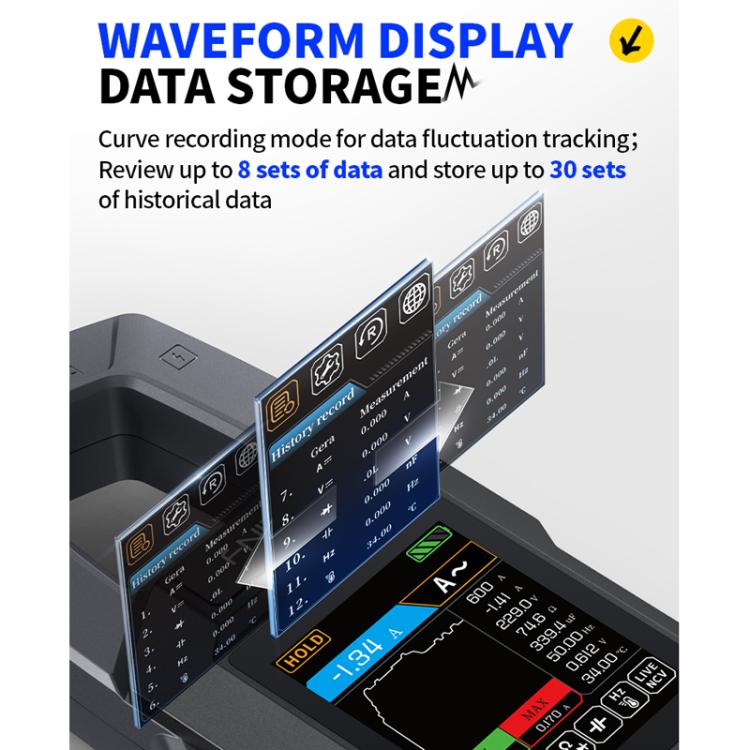 8. Equipped with a curve recording mode, data changes and fluctuations are clearly displayed. Supports viewing 8 sets of stored data and up to 30 sets of historical data, ensuring accurate and complete measurements.