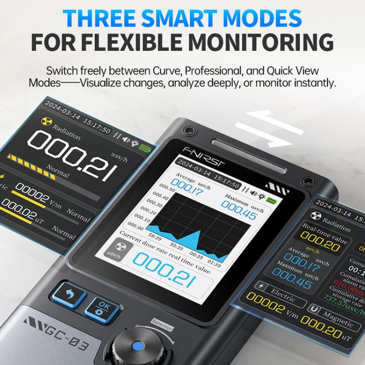 3. Three interfaces for flexible switching: Professional Mode provides clear insights into current environmental conditions; Quick View Mode displays readings instantly, while Curve Mode tracks radiation fluctuations over time