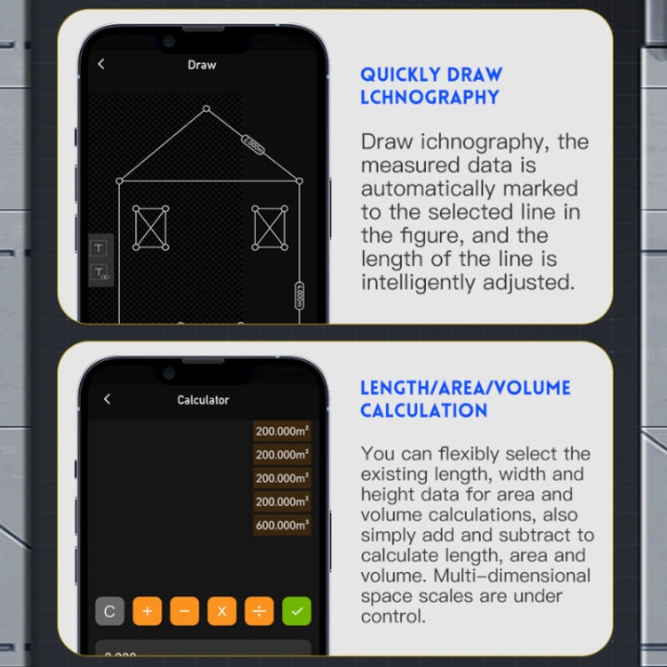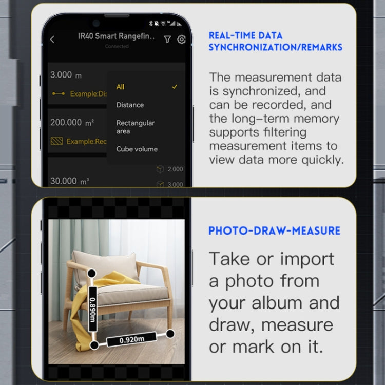 11. Linked with Mijia APP to realize data synchronization/notes, length/area/volume calculation, floor plan drawing, real-shot recording and other functions