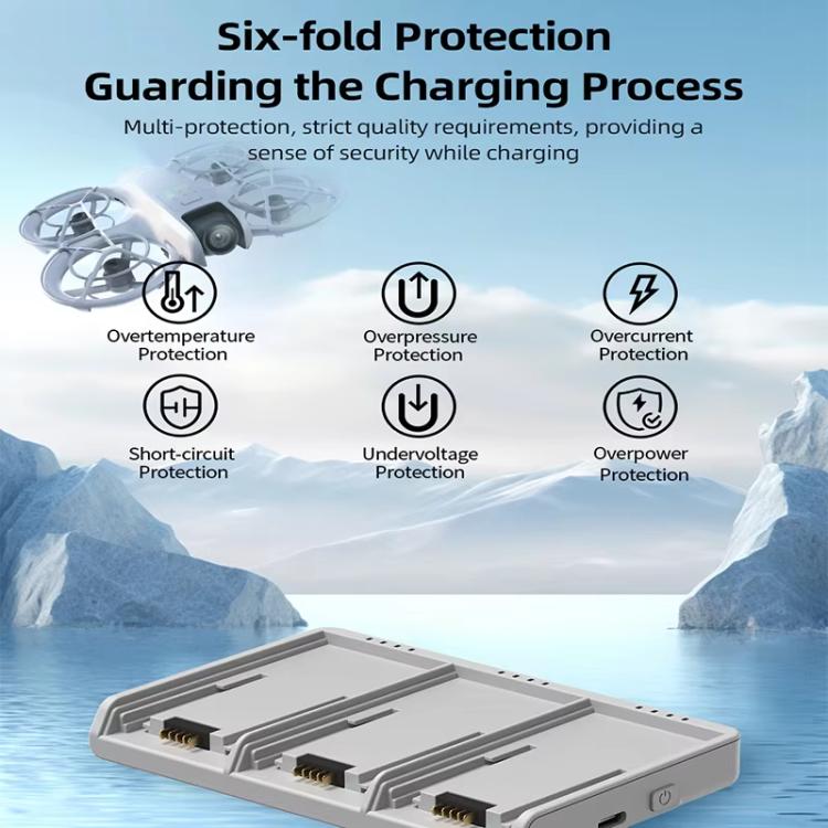 1. Suitable for DJI Neo two-way charging butler, can charge 3 batteries at the same time, and it takes about 45 minutes to fully charge three batteries (use an adapter greater than 65W when charging)