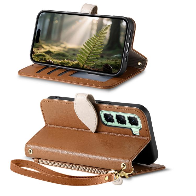 For Infinix Hot 50 Pro+ 4G Leaf Buckle Zipper Wallet Leather Phone Case with Strap(Brown)