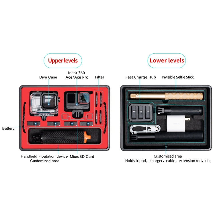 2. Large Capacity Storage: The dual-layer design provides ample storage space. The upper layer can accommodate the Insta360 Ace/Acepro camera, waterproof case, up to 4 batteries, up to 4 original filters, SD cards, floating handles, and expansion quick-release parts. The lower layer offers customizable storage for accessories such as the charging dock, extension rods, selfie sticks, charging adapters, tripods, and data cables. You can arrange and use the space according to your product accessories.