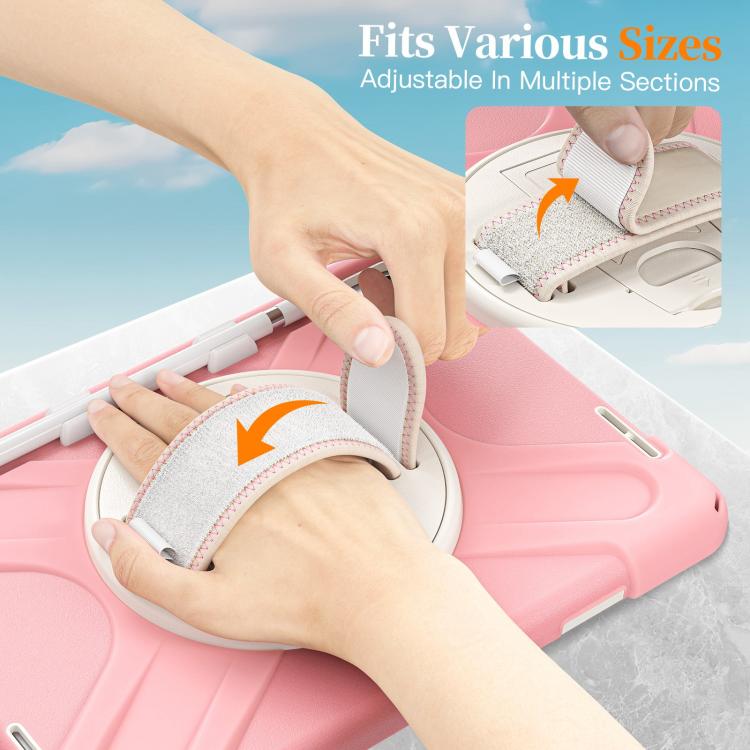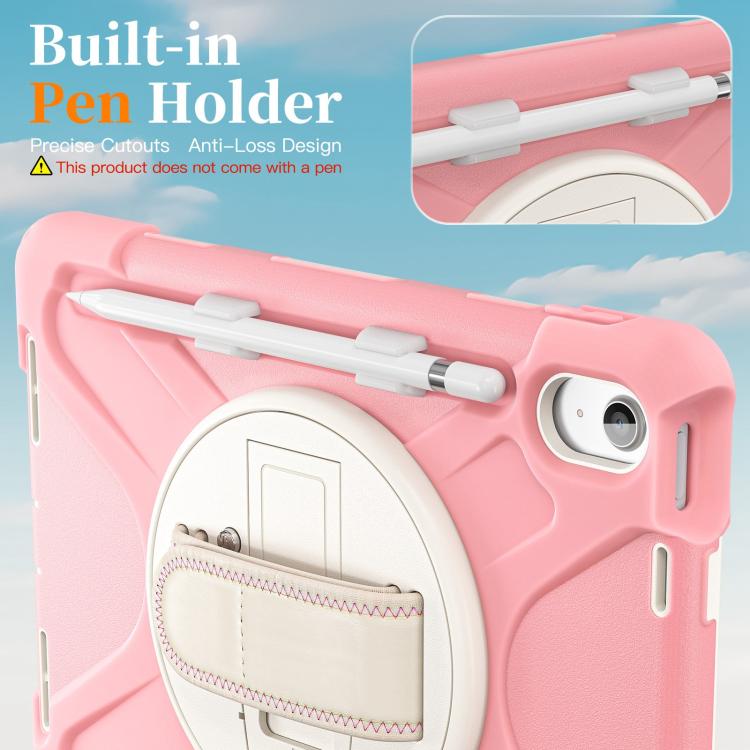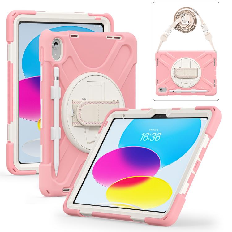 For iPad 2025 / 2022 Rotatable Holder Silicone Hybrid PC Tablet Case with Shoulder Strap & Pen Slot(Cherry Blossom Pink)