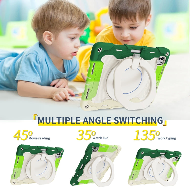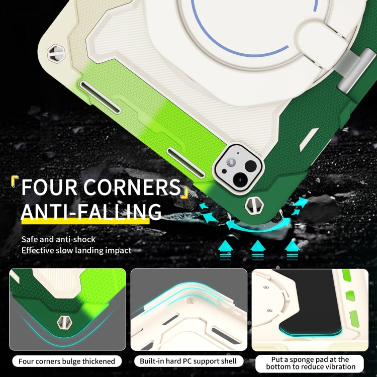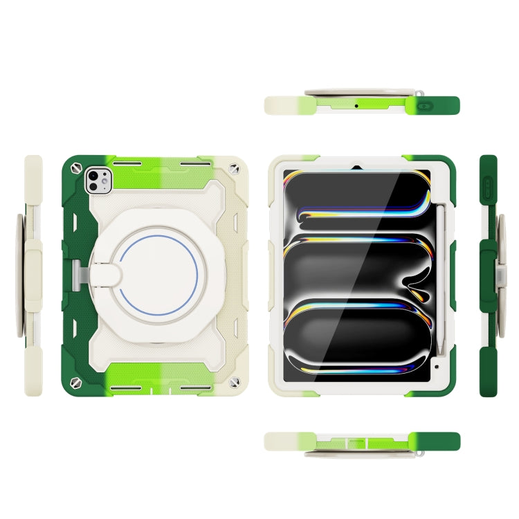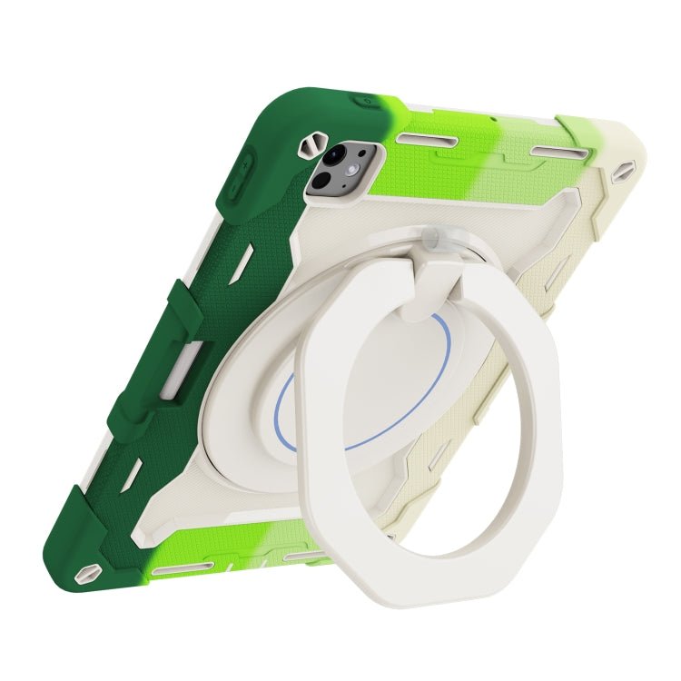 For iPad Pro 11 2024 Armor Portable Rotating Ring Holder Silicone Tablet Case with Pen Slot(Colorful Green)
