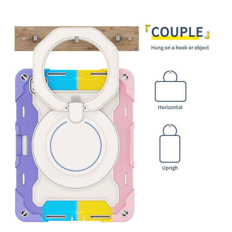 For iPad Pro 11 2024 Armor Portable Rotating Ring Holder Silicone Tablet Case with Pen Slot(Colorful Pink)