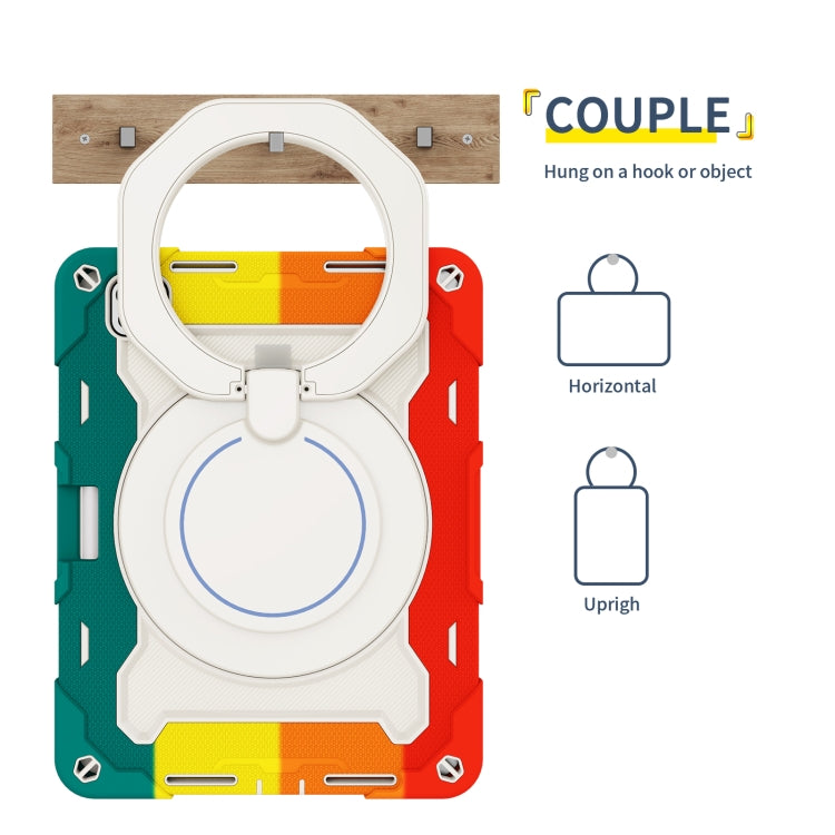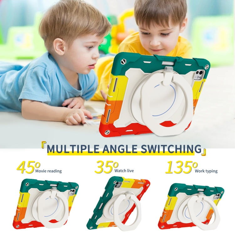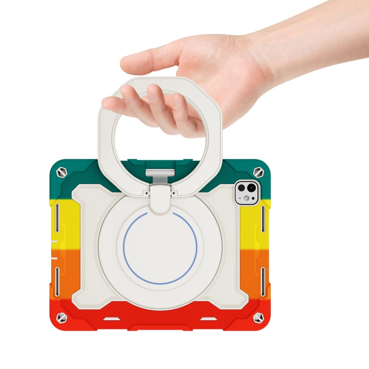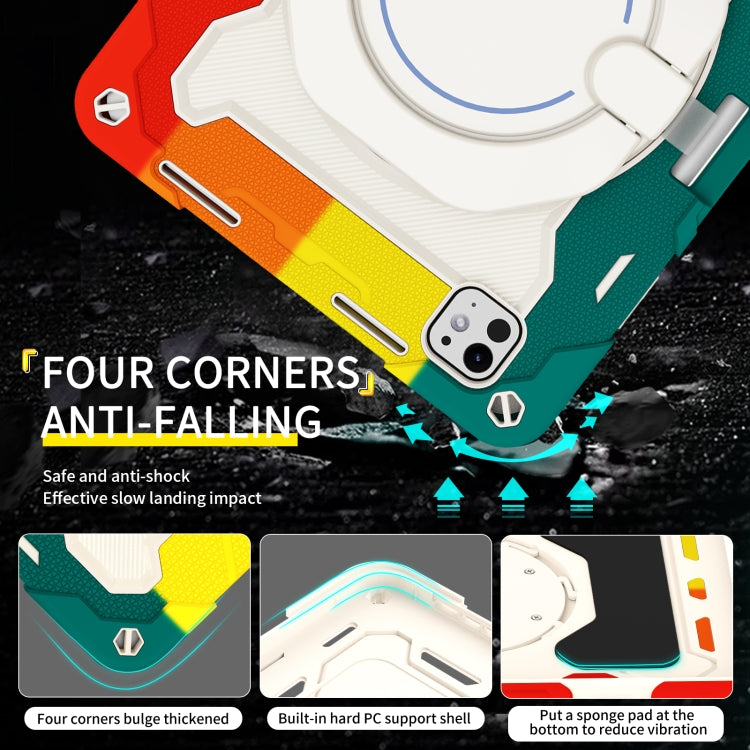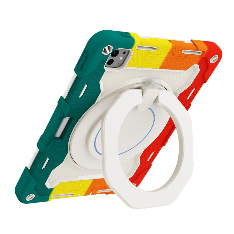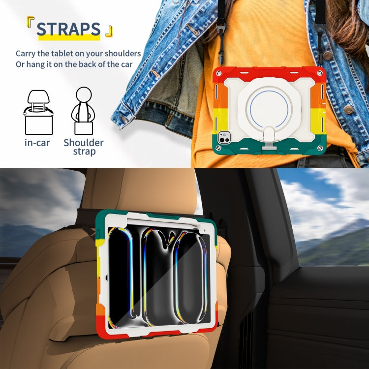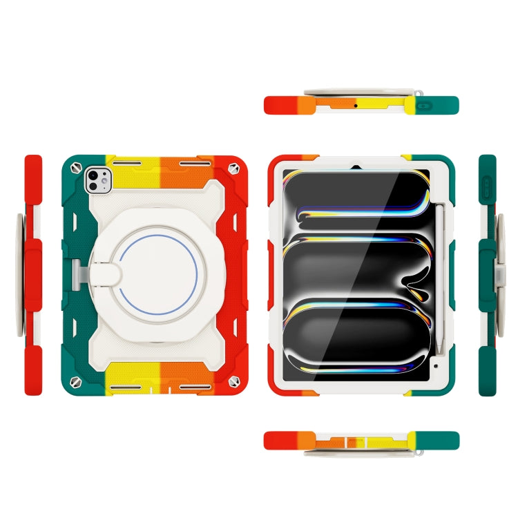 For iPad Pro 11 2024 Armor Portable Rotating Ring Holder Silicone Tablet Case with Pen Slot(Colorful Red)