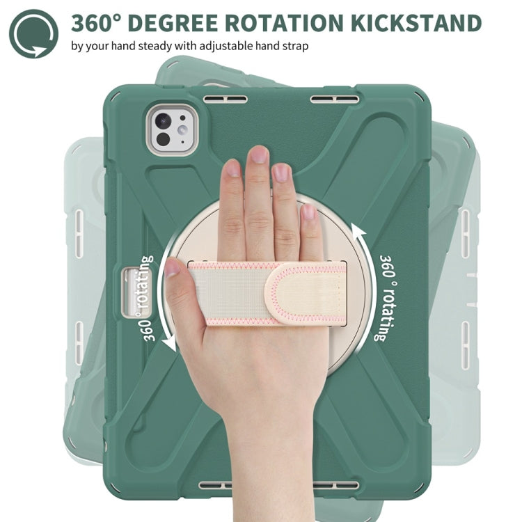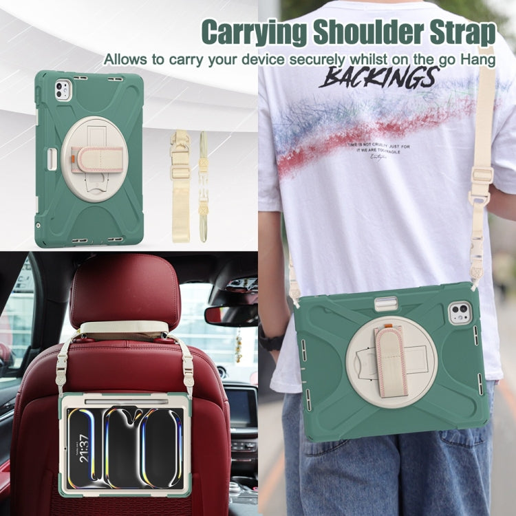 For iPad Pro 11 2024 Rotatable Holder Silicone Hybrid PC Tablet Case with Shoulder Strap(Emreald Green)