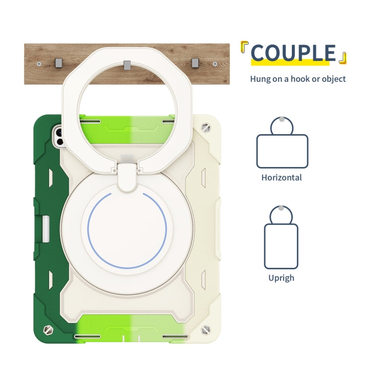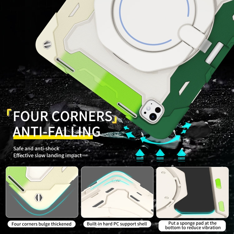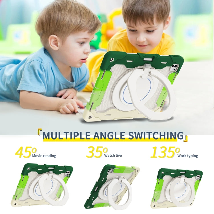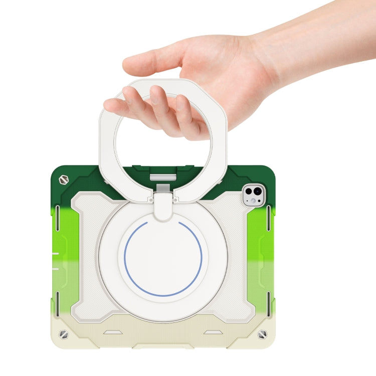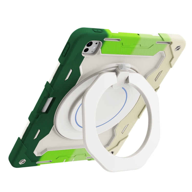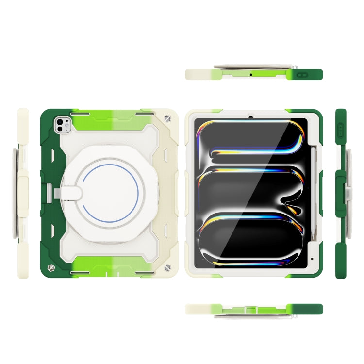 For iPad Pro 13 2024 Armor Portable Rotating Ring Holder Silicone Tablet Case with Pen Slot(Colorful Green)