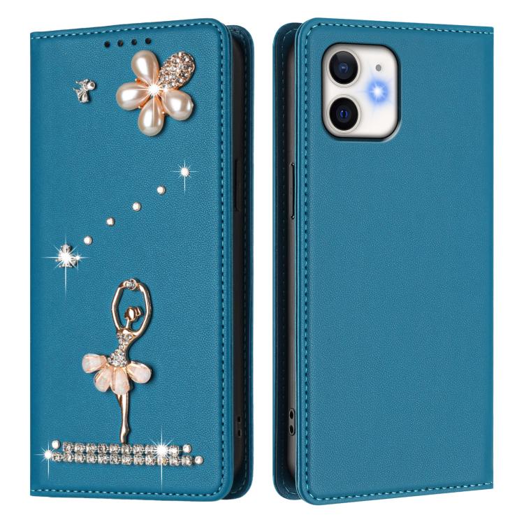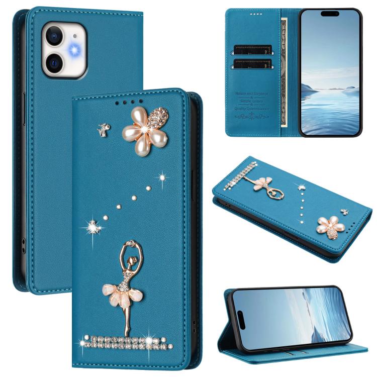 For iPhone 11 Ballet Girl Diamond Studded RFID Vegan Leather Phone Case(Lake Blue)