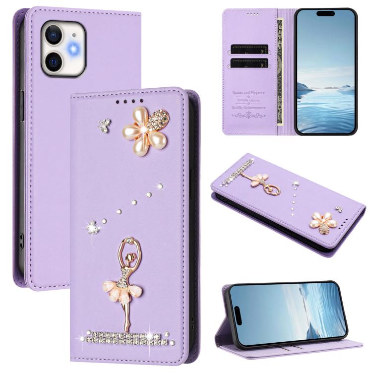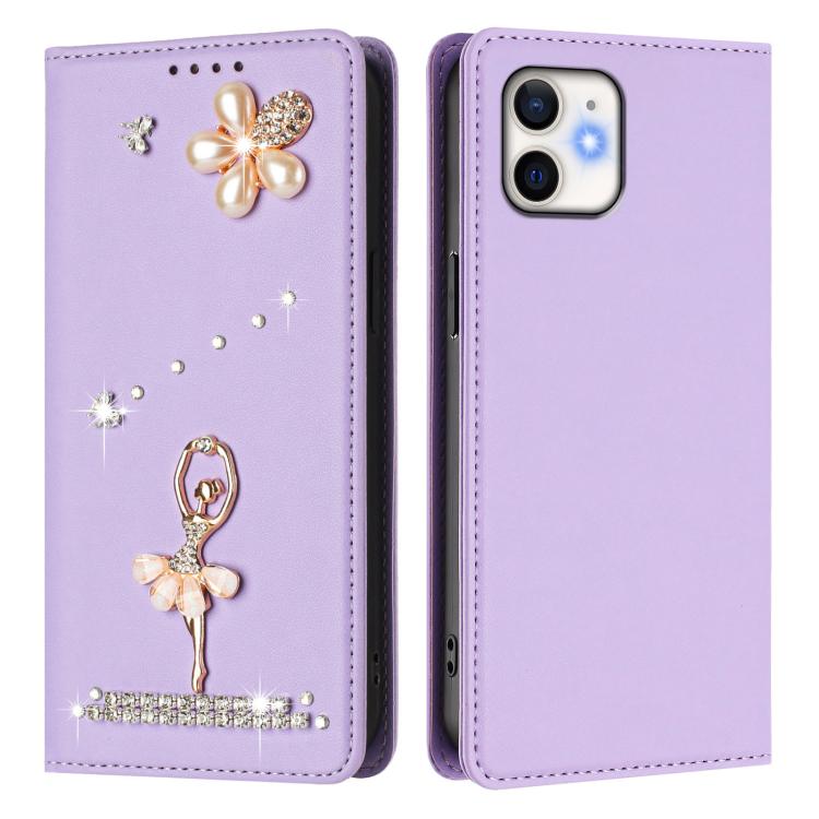 For iPhone 11 Ballet Girl Diamond Studded RFID Vegan Leather Phone Case(Light Purple)