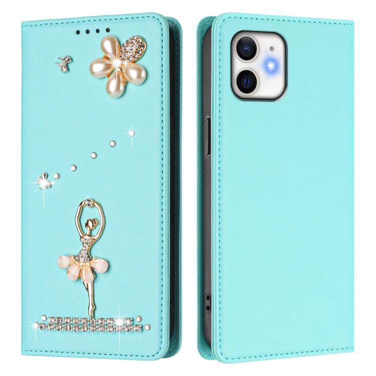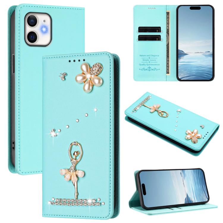 For iPhone 11 Ballet Girl Diamond Studded RFID Vegan Leather Phone Case(Mint Green)