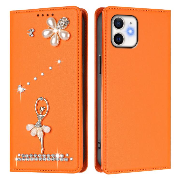 For iPhone 11 Ballet Girl Diamond Studded RFID Vegan Leather Phone Case(Orange)