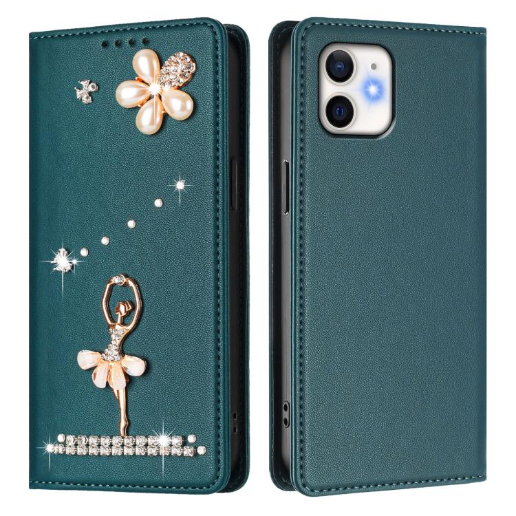 For iPhone 11 Ballet Girl Diamond Studded RFID Vegan Leather Phone Case(Peacock Green)