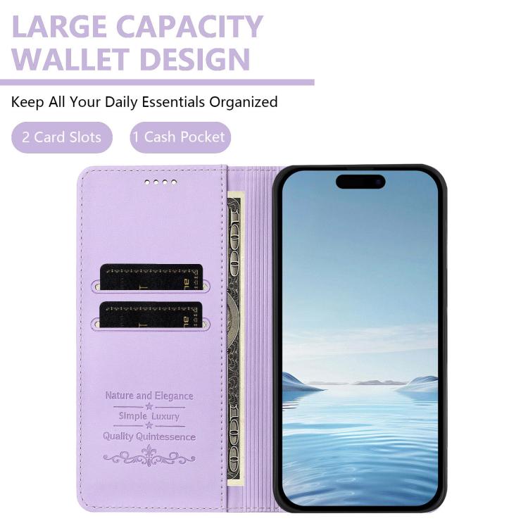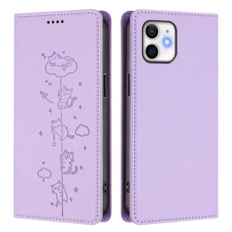 For iPhone 11 Cute Cats Embossed Magnetic RFID Vegan Leather Phone Case(Light Purple)