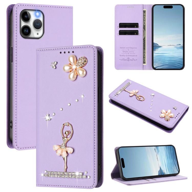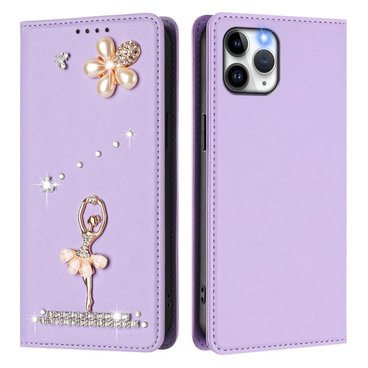 For iPhone 11 Pro Ballet Girl Diamond Studded RFID Vegan Leather Phone Case(Light Purple)