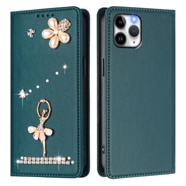 For iPhone 11 Pro Ballet Girl Diamond Studded RFID Vegan Leather Phone Case(Peacock Green)