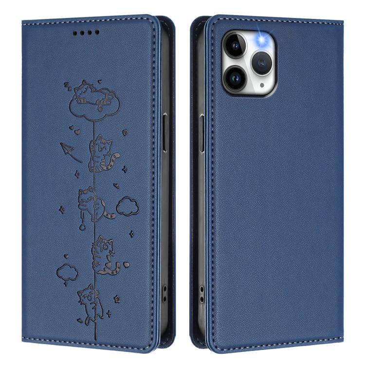 For iPhone 11 Pro Cute Cats Embossed Magnetic RFID Vegan Leather Phone Case(Dark Blue)