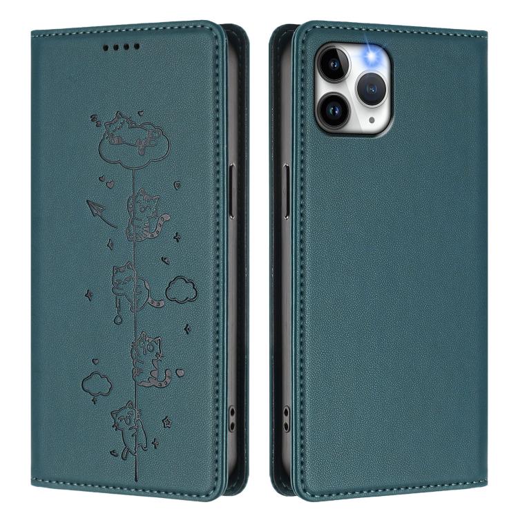 For iPhone 11 Pro Cute Cats Embossed Magnetic RFID Vegan Leather Phone Case(Peacock Green)