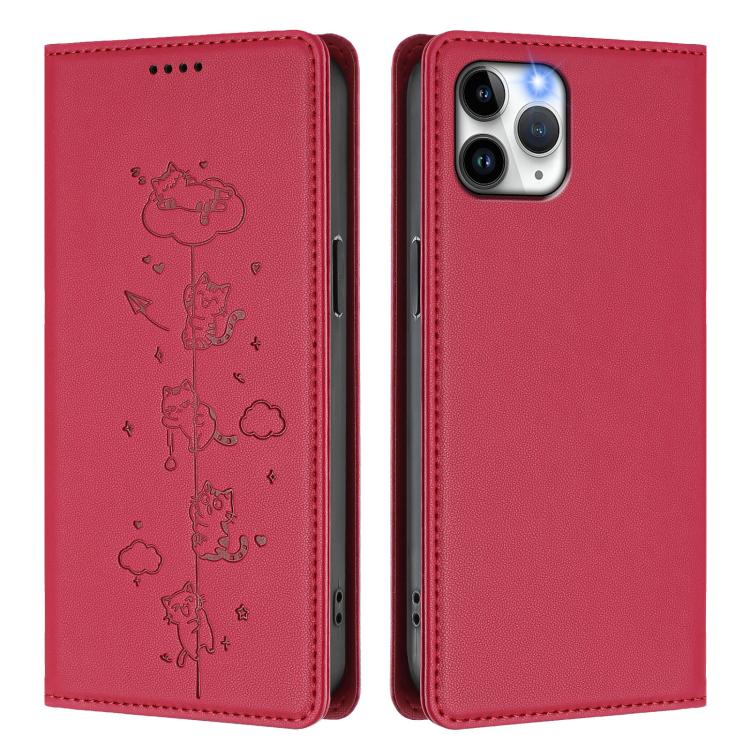 For iPhone 11 Pro Cute Cats Embossed Magnetic RFID Vegan Leather Phone Case(Red)