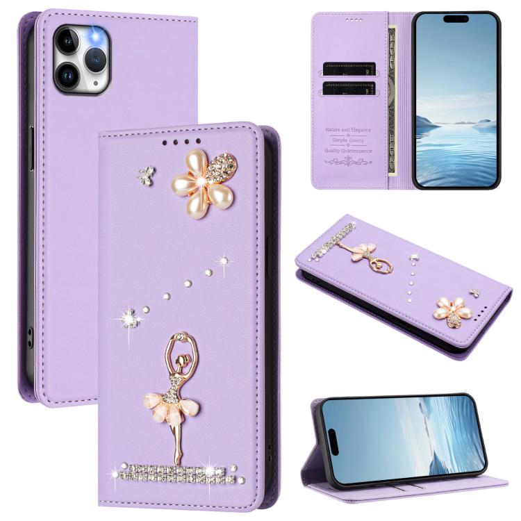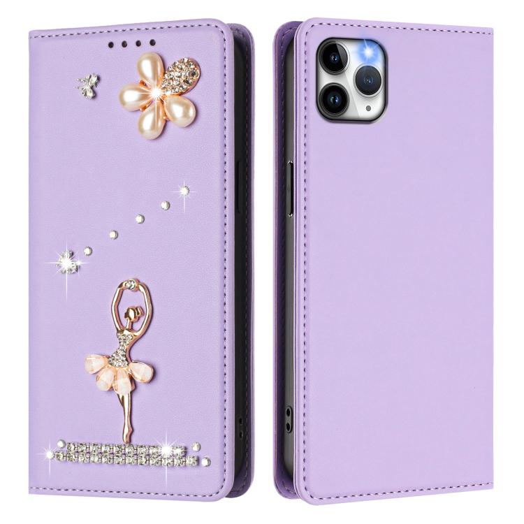 For iPhone 11 Pro Max Ballet Girl Diamond Studded RFID Vegan Leather Phone Case(Light Purple)