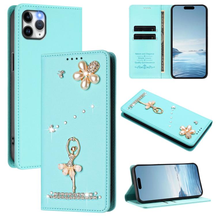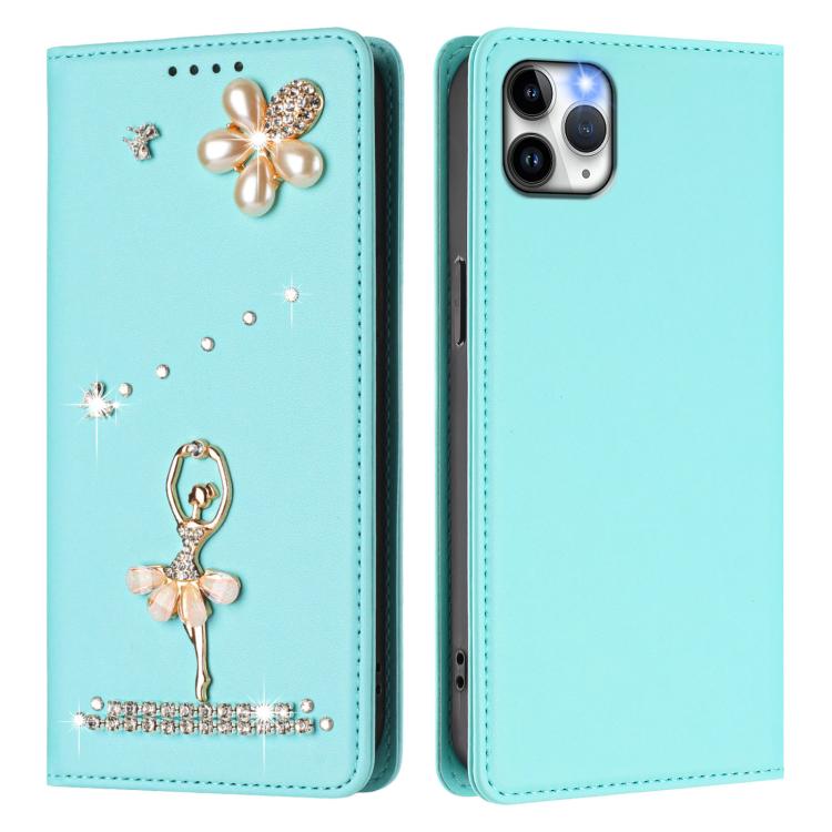 For iPhone 11 Pro Max Ballet Girl Diamond Studded RFID Vegan Leather Phone Case(Mint Green)