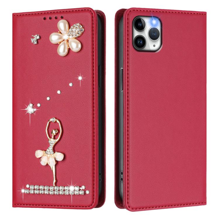 For iPhone 11 Pro Max Ballet Girl Diamond Studded RFID Vegan Leather Phone Case(Wine Red)