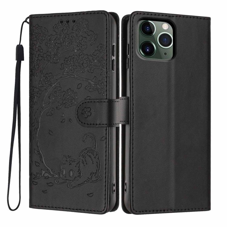For iPhone 11 Pro Tree Cat Embossed Flip Vegan Leather Phone Case(Black)