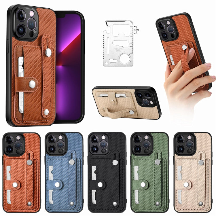 For iPhone 13 Pro Wristband Kickstand Card Wallet Back Cover Phone Case with Tool Knife(Blue)