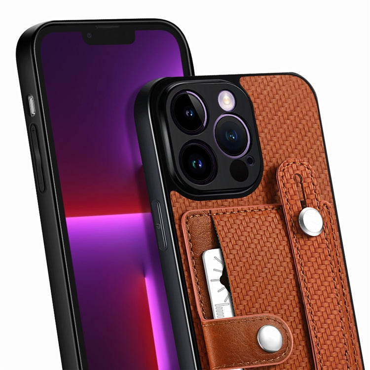 For iPhone 13 Pro Wristband Kickstand Card Wallet Back Cover Phone Case with Tool Knife(Brown)