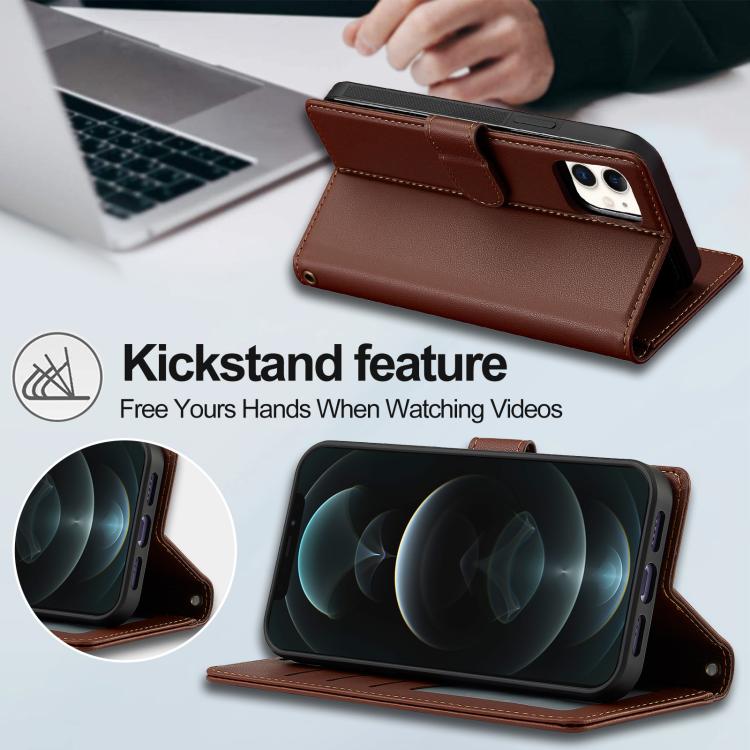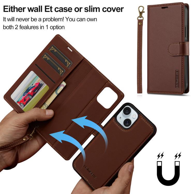 For iPhone 14 Plus LC.IMEEKE L2 Series Detachable Magsafe PU Phone Case with Lanyard(Brown)