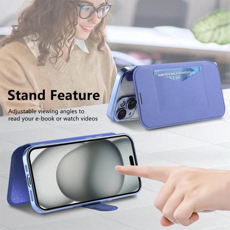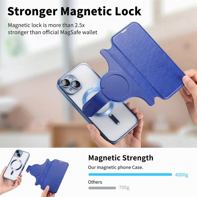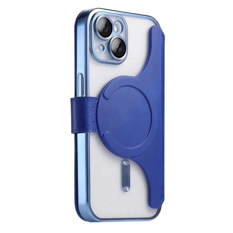 For iPhone 14 Plus Splitable Electroplated MagSafe RFID Anti-theft Leather Phone Case with Lens Film(Blue)