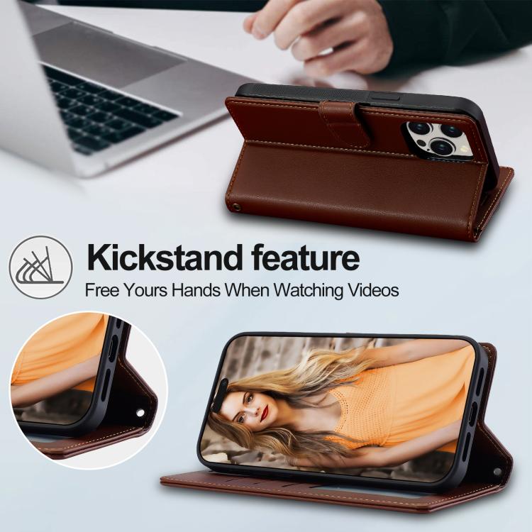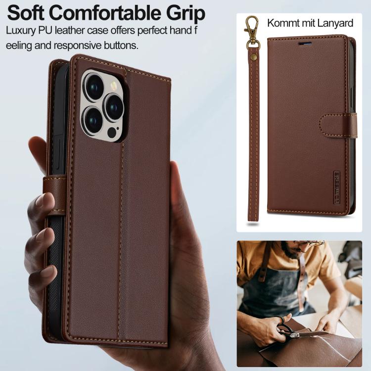For iPhone 14 Pro LC.IMEEKE L2 Series Detachable Magsafe PU Phone Case with Lanyard(Brown)