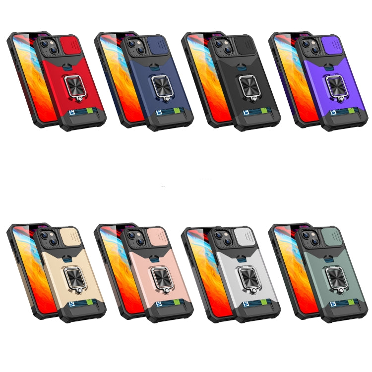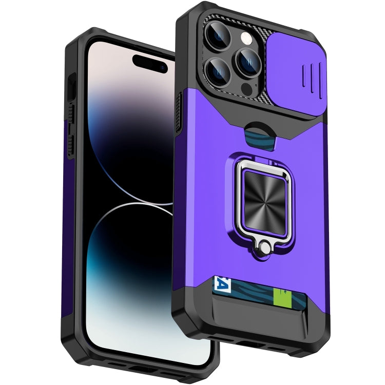 For iPhone 14 Pro Sliding Camshield Card Slot Ring Kickstand Phone Case(Purple)
