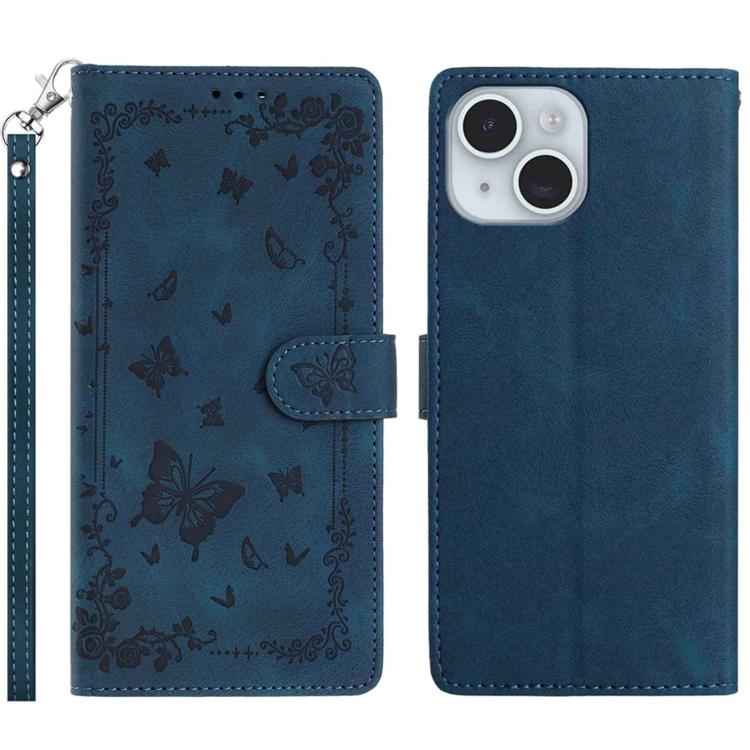 For iPhone 14 Secret Garden Butterfly Pattern Leather Phone Case(Dark Blue)